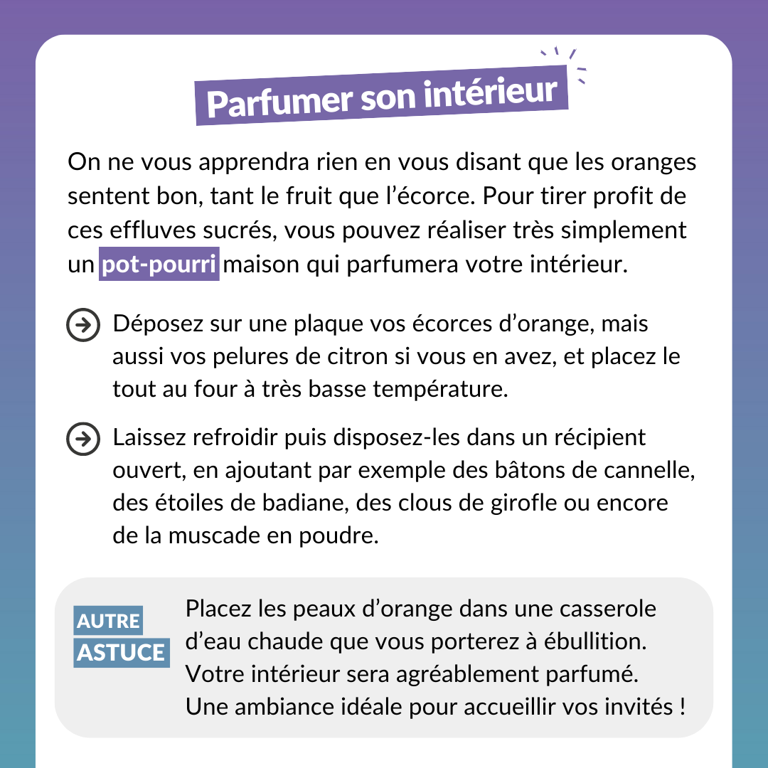 Autre astuce : placez les peaux d’orange dans une casserole d’eau chaude que vous porterez à ébullition. Votre intérieur sera agréablement parfumé. Une ambiance idéale pour accueillir vos invités !