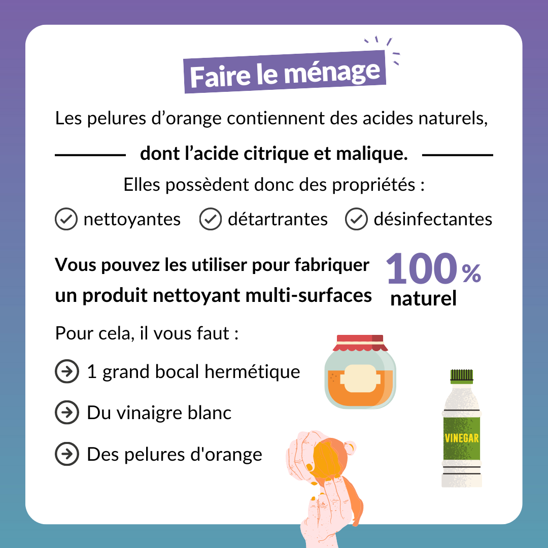 Les pelures d’orange contiennent des acides naturels, dont l’acide citrique et malique. Elles possèdent donc des propriétés nettoyantes, détartrantes et désinfectantes.