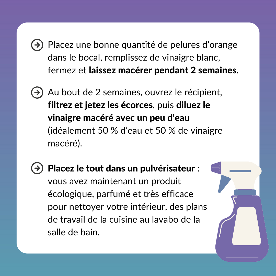 Placez une bonne quantité de pelures d’orange dans le bocal, remplissez de vinaigre blanc, fermez et laissez macérer pendant 2 semaines. Au bout de 2 semaines, ouvrez le récipient, filtrez et jetez les écorces, puis diluez le vinaigre macéré avec un peu d’eau (idéalement 50 % d’eau et 50 % de vinaigre macéré). Placez le tout dans un pulvérisateur : vous avez maintenant un produit écologique, parfumé et très efficace pour nettoyer votre intérieur, des plans de travail de la cuisine au lavabo de la salle de bain.