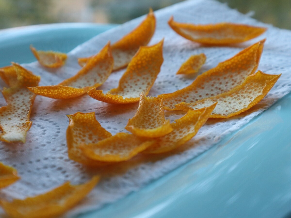 La première étape consiste à récupérer uniquement la partie orange, sans la partie blanche. Épluchez donc les écorces d’orange avec un économe. Ensuite, vous devez faire sécher les épluchures. Pour cela, vous pouvez utiliser le micro-ondes, pendant 1 minute maximum (faites attention à ce que les pelures ne brûlent pas) ou le four traditionnel, pendant une heure à 110 degrés. Si vous avez de la patience et que vous habitez une région ensoleillée, vous pouvez aussi placer les pelures au soleil dans une assiette pendant plusieurs jours.