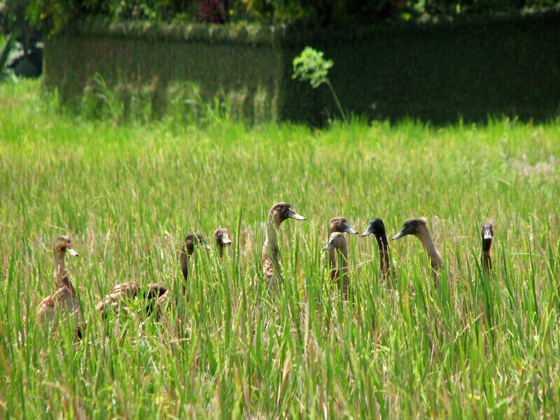 À Bali, au détour des rizières, il y a aussi d’innombrables canards. La raison est simple : ils se nourrissent de panisses et triangles, deux nuisibles des rizières. Cependant, ils ne touchent pas au riz, car la feuille est dure et coupante. Les fientes des canards fertilisent le sol et petit bonus, le fait de patauger dans les rizières en continu permet à la terre d’être mieux aérée et de rendre l’eau trouble. Cela évite aux rayons du soleil de pénétrer et donc, de faire pousser les nuisibles.