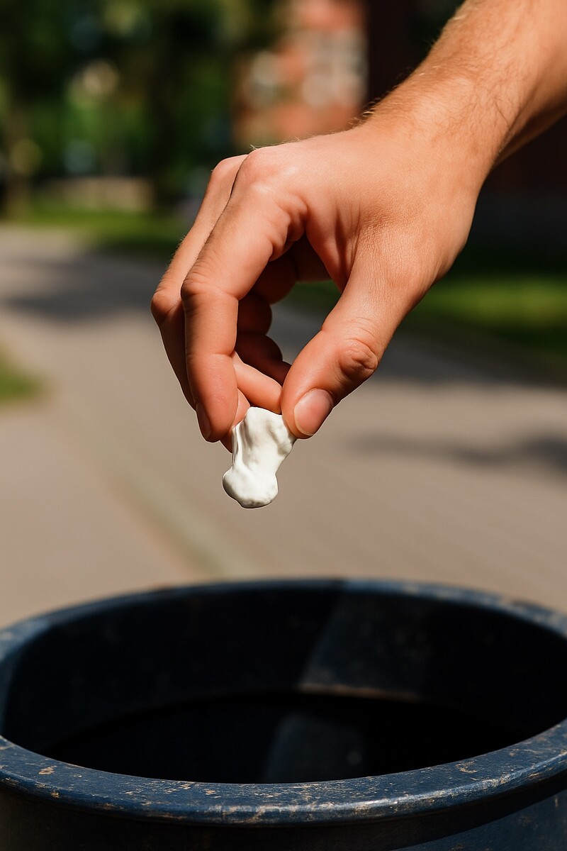 D’une part, on ne le mange pas (heureusement), donc une fois l’arôme dissipé, beaucoup de gens le jettent. Et soyons honnêtes : bien souvent, le chewing-gum finit collé sous une table ou craché dans la rue 😖. Étant du plastique, il n’est pas biodégradable : un chewing-gum jeté par terre peut mettre des années, voire des décennies à se dégrader, tout en se fragmentant en microplastiques. C’est un déchet urbain très répandu (regardez les trottoirs noircis de tâches rondes, surtout en été, ce sont des centaines de gommes collées). Chaque année, on produit plus de 2,4 millions de tonnes de chewing-gum dans le monde, une bonne partie finit dans la nature ou incinérée. Pour un objet censé n’être qu’éphémère, l’héritage environnemental est lourd : pollution visuelle (la fameuse gomme fossilisé sur le béton), nettoyage coûteux pour les municipalités, et ajout de plastique inutile dans l’environnement.