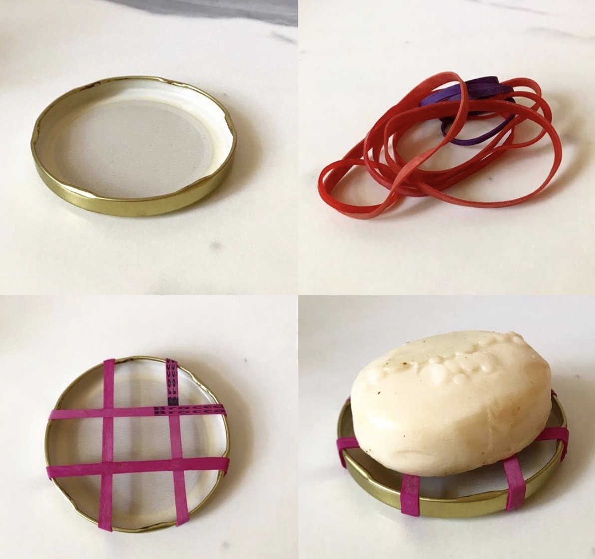 Un couvercle de bocal en verre, quatre élastiques, voilà le matériel nécessaire pour concevoir un porte-savon minimaliste. Réalisez un damier comme un tic-tac-toe autour du couvercle et c’est tout ! C’est pratique, c’est zéro déchet et c’est surtout très facile à réaliser. Ce joli modèle est une réalisation de l’instagrameuse @rocket_science
