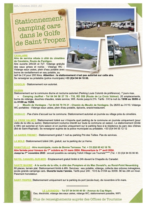 À défaut, les camping-cars peuvent également stationner sur les autres installations du golfe de Saint-Tropez prévues à cet effet comme les parkings de Gassin ou celui de Sainte-Maxime en arrière-plan de la ville.