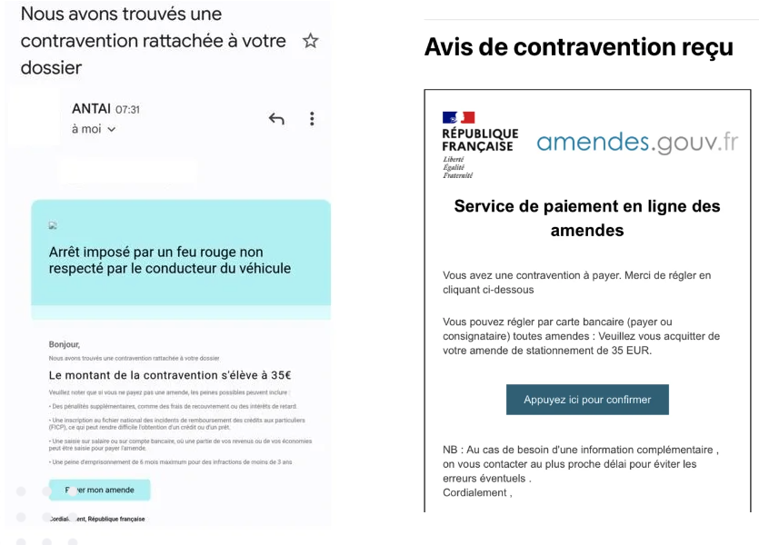 L’hameçonnage, aussi appelé phishing en anglais, est une méthode utilisée par les escrocs pour récupérer des informations confidentielles (identité, données bancaires) en usurpant l’identité d’un organisme existant. Dans ce cas précis, l’arnaque à la fausse contravention reprend les codes de l’ANTAI (Agence nationale de traitement automatisé des infractions) ou du site de paiement en ligne amendes.gouv.fr.