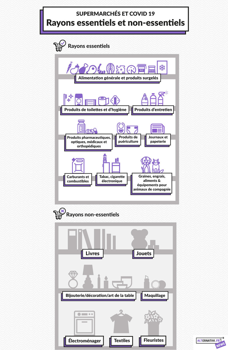 Les grandes surfaces doivent fermer leurs rayons qui ne sont pas de première nécessité : les rayons textiles, chaussures, culture (livres, CD, DVD, jeux vidéos), jouets, bijoux, électroménager, meubles et fleurs.