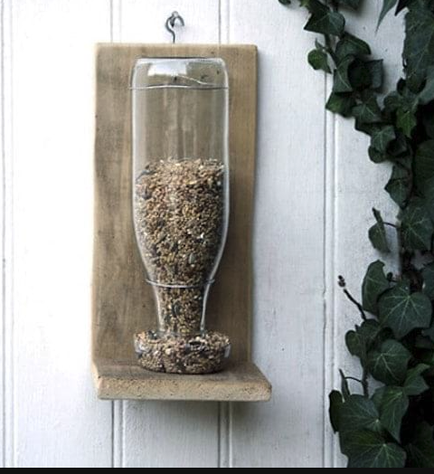 Si vous voulez fabriquer une mangeoire économique et esthétique, qui distribue automatiquement les graines, procurez-vous une jolie bouteille en verre et deux planches de bois qui serviront de support. Il vous faudra aussi une petite coupelle, de la colle, un crochet, une perceuse, des vis, une agrafeuse et du fil de fer.
