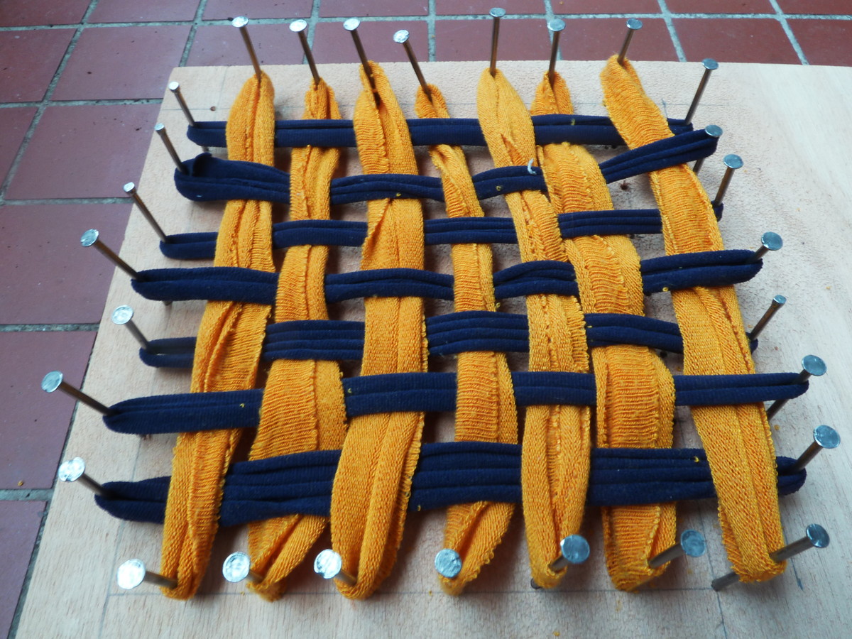 • Détachez une première boucle de tissu (boucle n° 1) d’un clou, dans un angle de votre métier à tisser, ainsi que la boucle d’à côté (boucle n° 2).