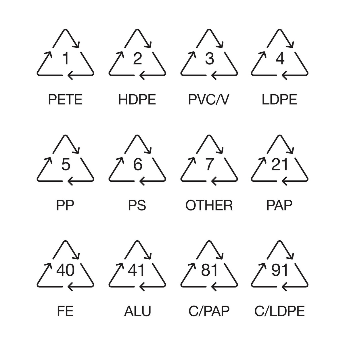 Ces triangles à flèches reprennent le symbole universel des produits recyclables créé dans les années 1970. Il s’agit du cercle de Möbius, auquel sont ajoutés des numéros et des lettres qui donnent des indications sur la catégorie de plastique et son sort final. Décryptons leur signification.