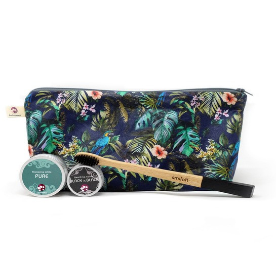 Ce coffret cadeau contient : une trousse de voyage en coton enduit au motif tropical, un shampoing et un dentifrice solides avec leur boîte de rangement en métal ainsi qu’une brosse à dents écologique à la tête interchangeable. L’idéal du slow voyageur réuni dans une petite trousse facile et pratique à emmener partout avec soi, y compris en cabine puisque ce qu’elle contient est autorisé en avion. De quoi faire un brin de toilette partout dans le monde, sans rien qui ne risque de couler au fond du sac !