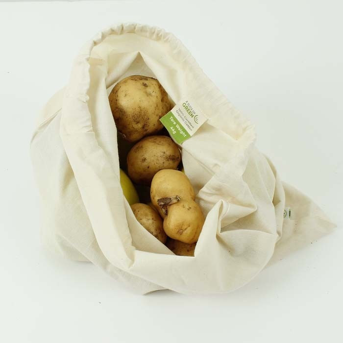 Avant de partir faire vos courses, emportez avec vous ce grand sac à vrac 34 x 38 cm, en le glissant dans votre sac à main. Petite astuce pour ne jamais l’oublier : après usage, rangez-le systématiquement dans votre sac. Une fois sur place, remplissez ce grand sac en coton biologique des légumes que vous aurez choisi, par exemple des pommes de terre. Lors de la pesée, précisez le poids du sac à votre primeur : 57 grammes. En cas d’oubli, sachez que son poids est toujours indiqué sur l’étiquette présente à l’intérieur du sac.